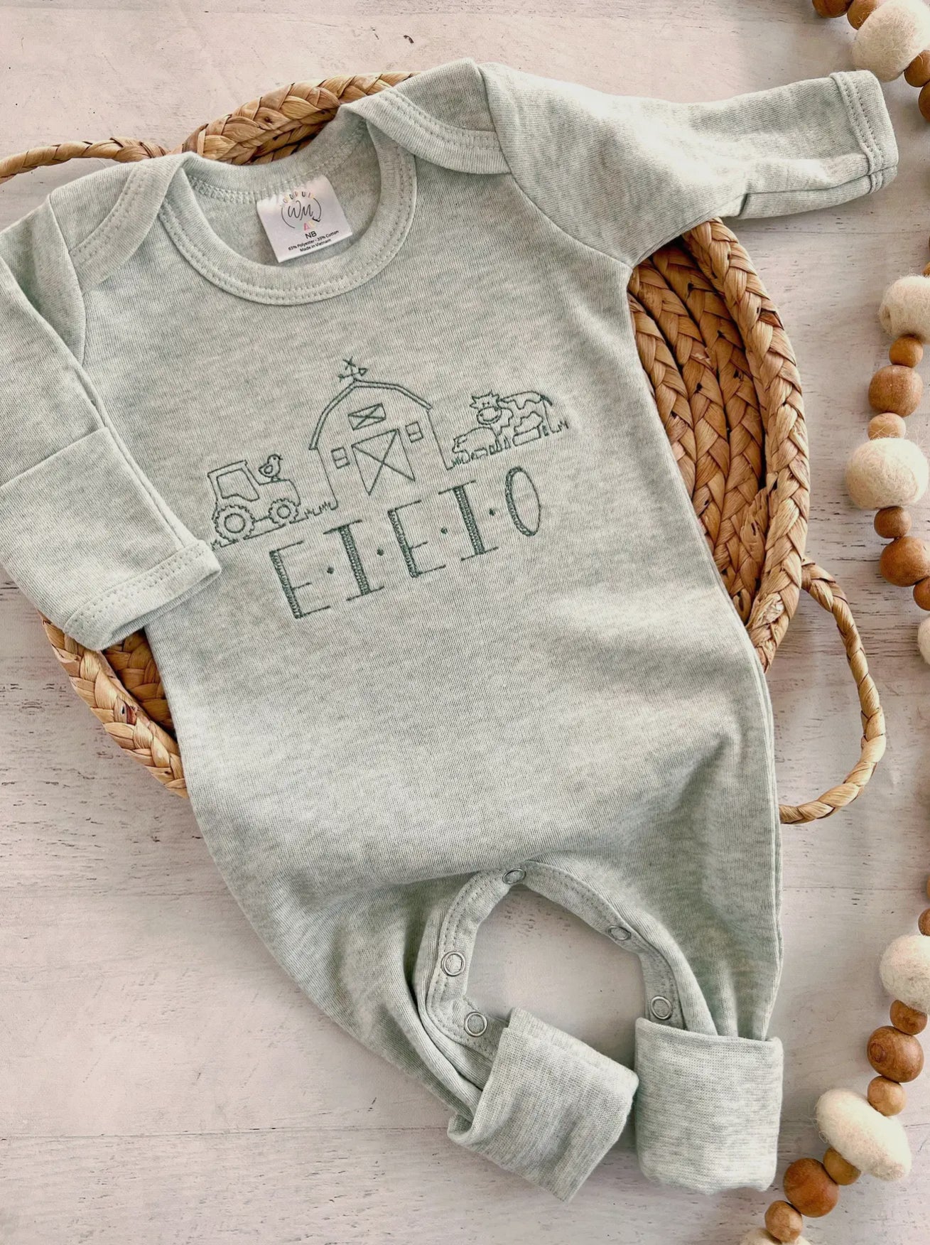This outfit makes a perfect baby announcement outfit, coming home outfit, newborn pictures, or baby shower gift. This sweet sleeper is soft and comfortable to snuggle a little one in super soft cotton and poly blend. It has fold over mittens, fold over footies that also cuff, and snaps on the legs for easy changing access. All embroidered items have a soft mesh backing to cover stitching on the underside of the garment, to protect thread from rubbing or causing discomfort.
