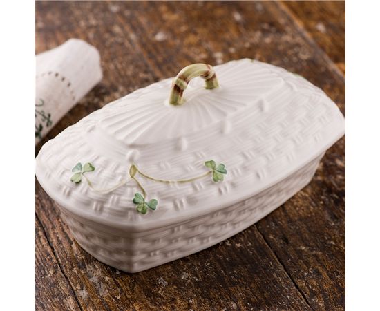 Accentuate your Shamrock collection by displaying your butter or margarine in this stunning Shamrock Butter Dish. Made from Irish Porcelain, this butter dish is handmade and hand painted by the talented craftsmen and women working within the Belleek Pottery Factory in Ireland.