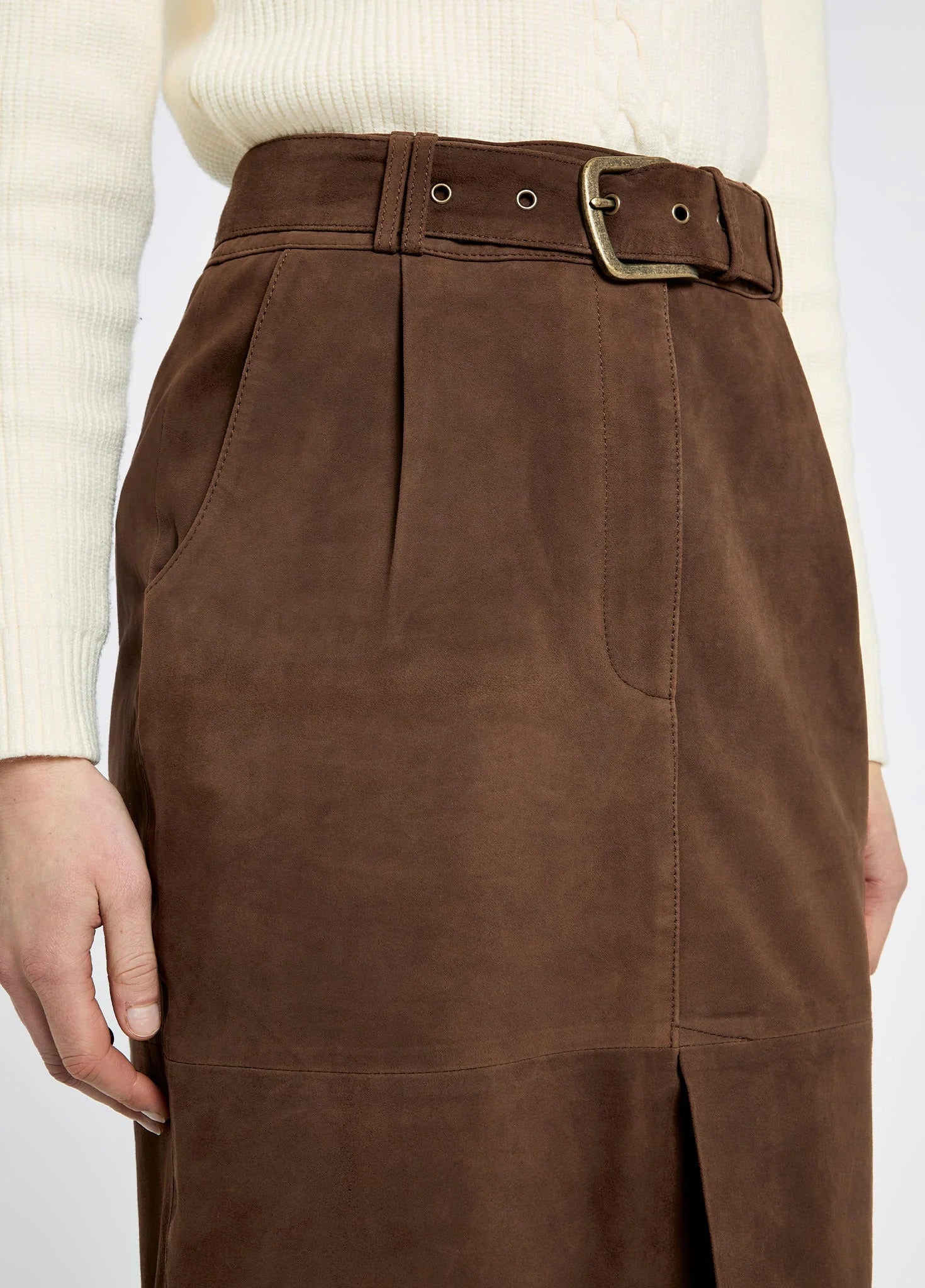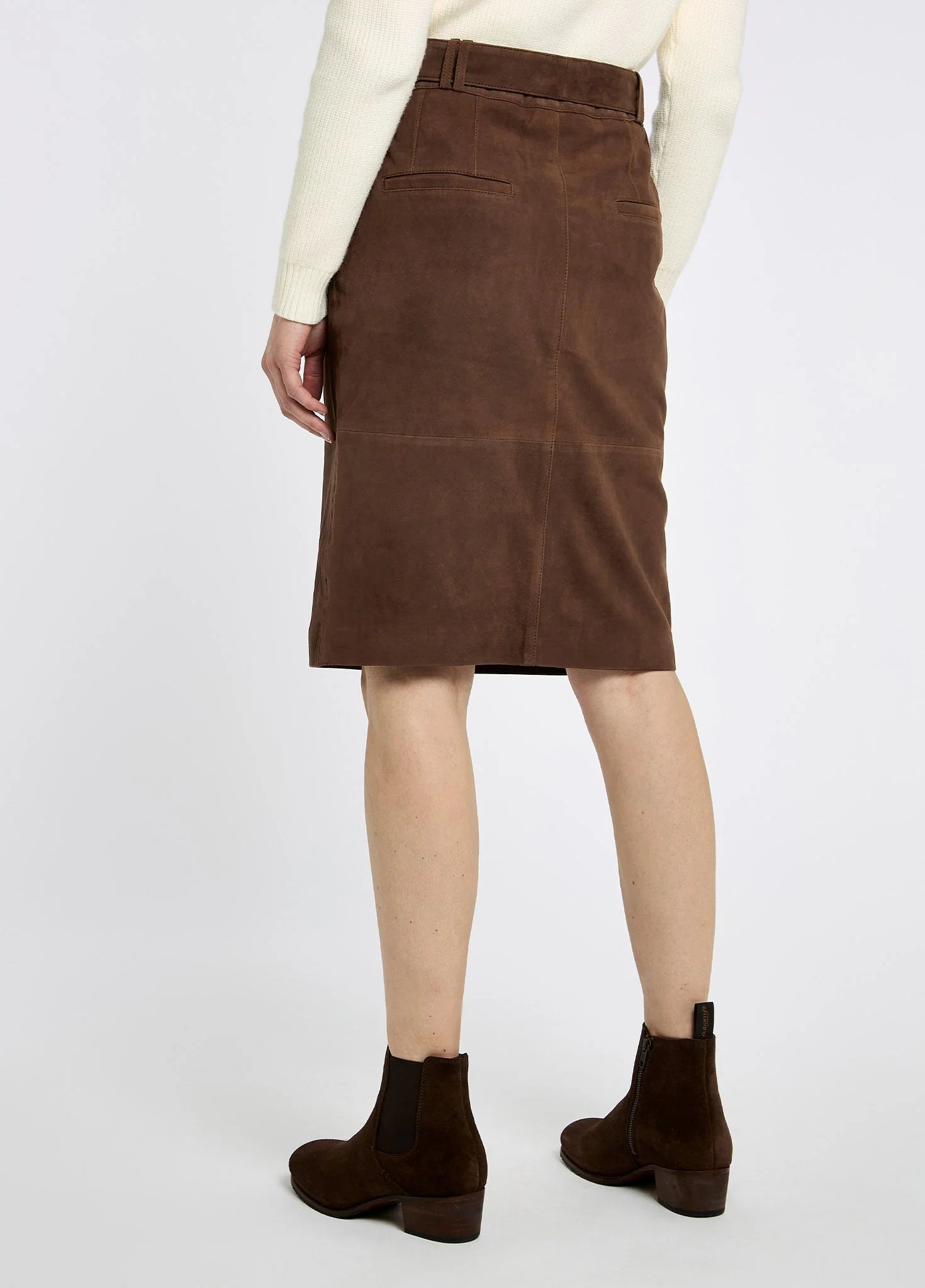 A beautiful investment piece, the Sullivan knee length skirt will be with you for years. Soft walnut goat suede is fully lined and features front pleats for a comfortable fit. Pockets add a relaxed touch to this sophisticated skirt which can be dressed up or down with your favorite shirting or knitwear.