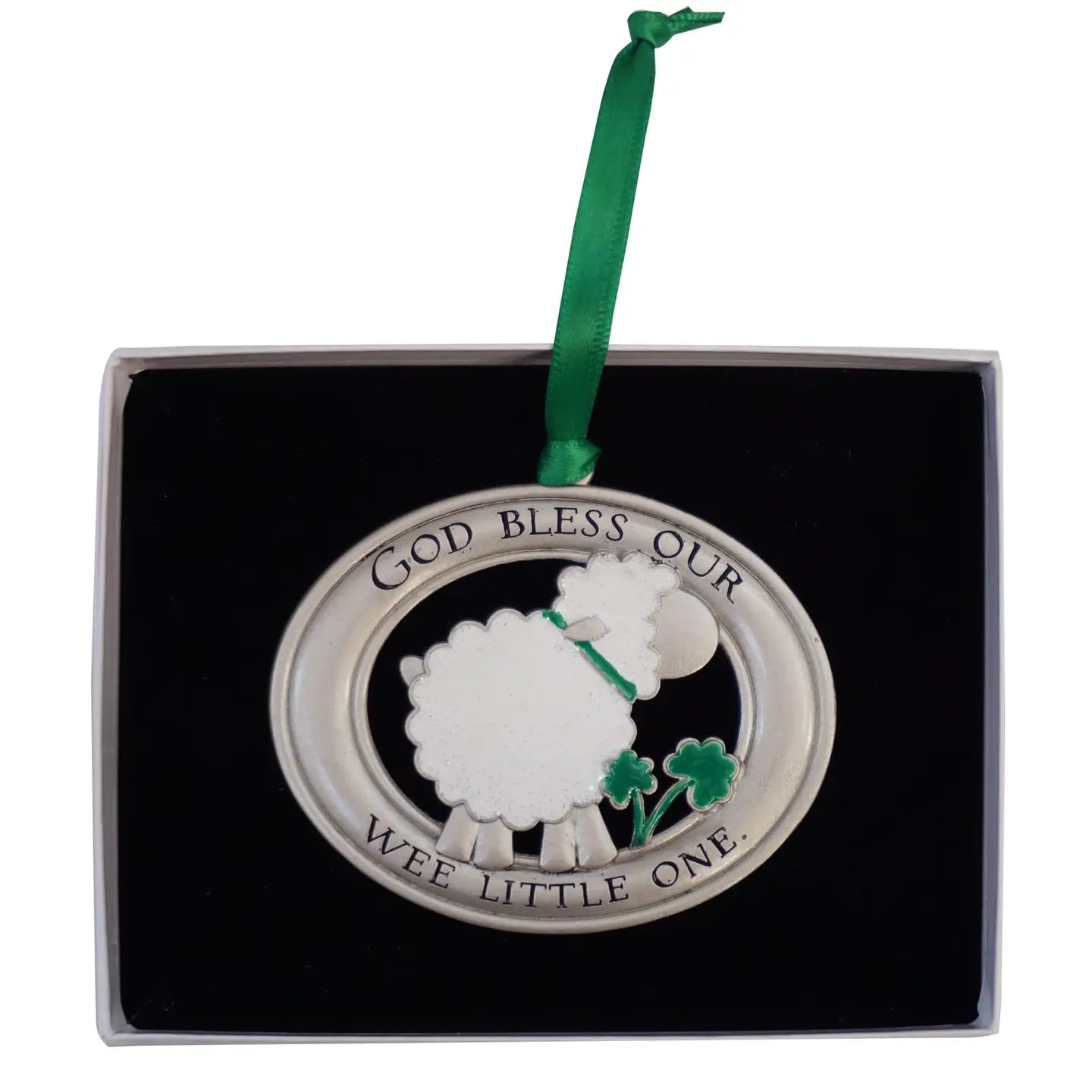 Crib medal in silver enamel finish featuring an adorable little lamb with white glitter epoxy body and green epoxy collar and shamrock accents. Message of comfort and faith for baby reads "God bless our wee little one." Hangs from green ribbon. 3 ¼” x 2 ½”. Gift boxed.