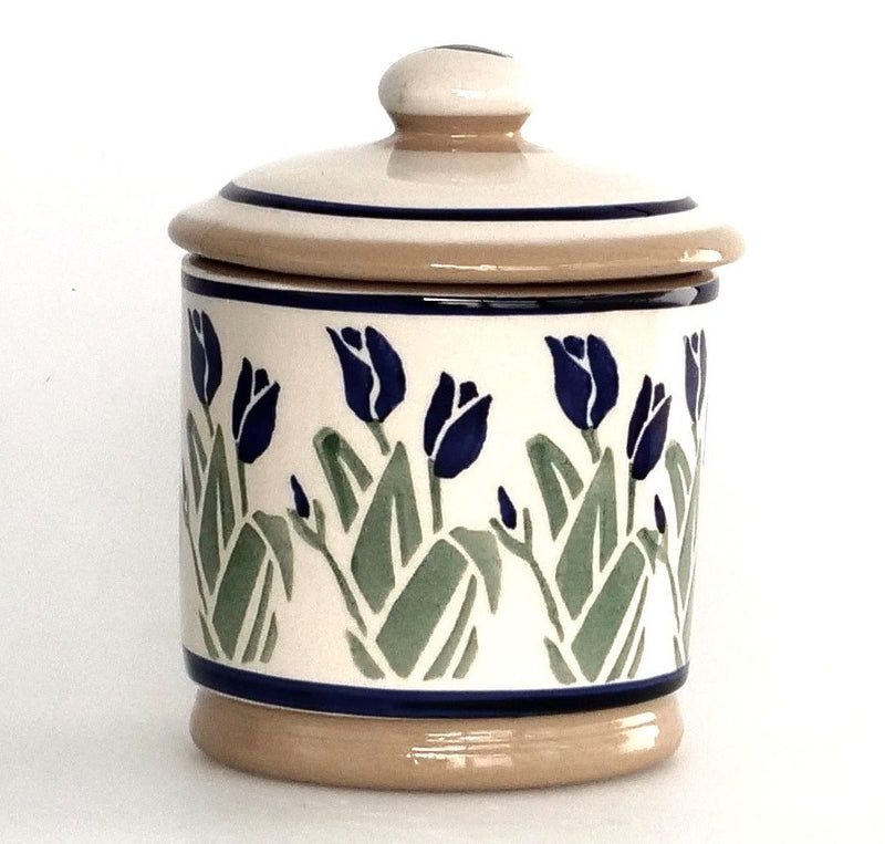 This lidded sugar bowl is the perfect size for tea time or coffee service. Blue tulips dance around the side in a medium blue with sage green leaves.