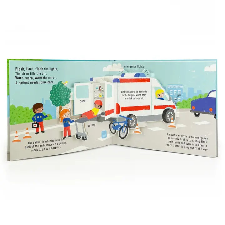 A firetruck, an ambulance, a rescue boat, a police motorcycle, and an airlift helicopter— these vehicles all help people in need! Learn about the important jobs these vehicles do along with all sorts of fun facts in this engaging, five-spread pop-up book designed for kids ages 3 to 5 years old. * 5 fun pop-up spreads to read and interact with. * Perfect for any child who loves trucks and things that go. * Excellent early learning content for little ones interested in vehicles. * Charming and colorful illustrations that come to life as they pop off the page.