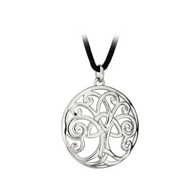 Rhodium pendant featuring a Trinity knot in the center of the Tree of Life. 19" cord with 2" extension. Approx. 1.25" in diameter. Allergy safe. Imported from Solvar of Dublin.