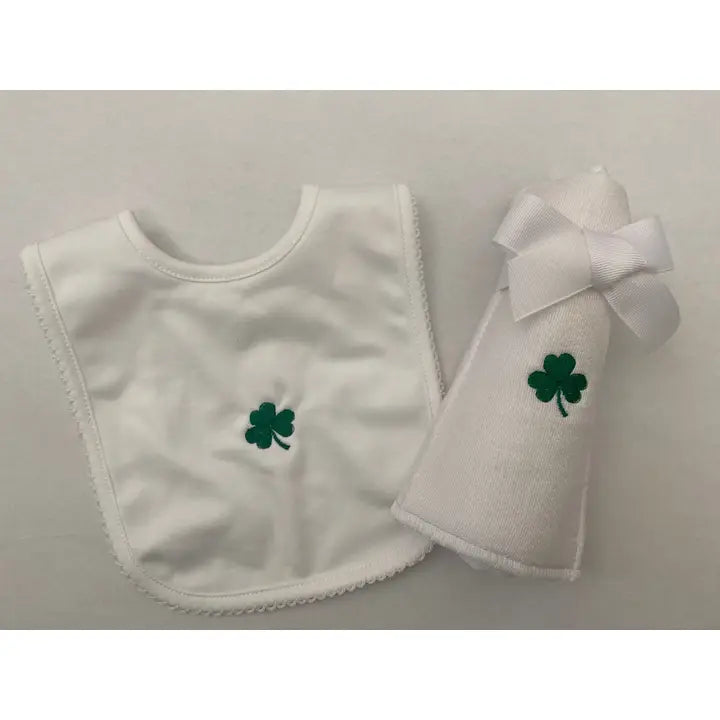 This sweet pima cotton bib and burp cloth set features cute shamrock design. Great for a gift!
