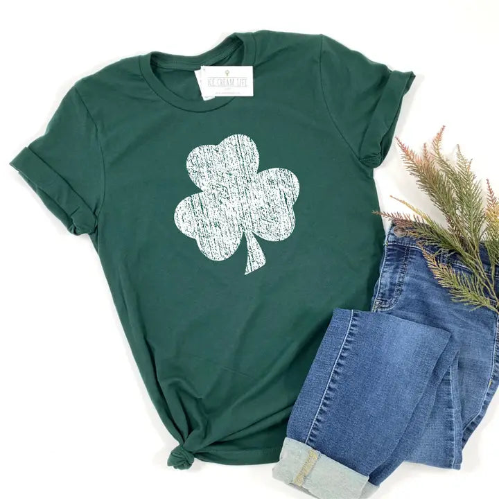 Vintage Shamrock Kids Tee available in Toddler and Youth sizes Professionally screen printed. Shirt color is Forest Green. Print color is White. Design is distress printed for a vintage look. Kids tees are soft and comfy made of 100% ringspun cotton. Fit is true to size.