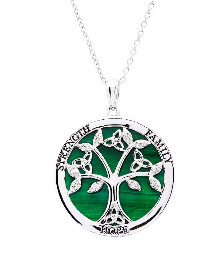 This stunning necklace from ShanOre is sure to dazzle any outfit. With a deep green malachite background, the sterling silver Tree of Life stands out with Trinity knots and Swarovski crystals. "Strength Family Hope" is inscribed around the edge.