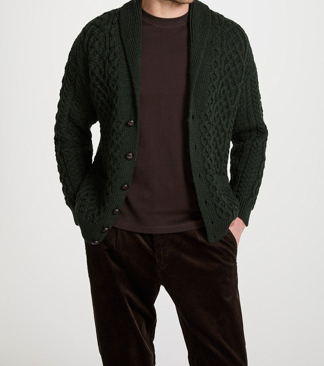 This cozy men's shawl collar cardigan features a combination of many traditional stitch patterns, including honeycomb, trellis stitch, and cables, with moss stitch at the sides for a smooth finish. With 6 traditional Aran football buttons at the center front, the 1x1 ribbed shawl collar matches the rib detail on the 2 pockets, cuffs and hem. This versatile design works well with jeans and a T shirt for casual weekend style. Or pair with dark colored trousers or chinos and a shirt for a more sophisticated look. This piece delivers a contemporary twist on the classic Aran cardigan style. Knitted in 5gauge 100% Merino Wool. Standard men's fit. Designed and made in Ireland.