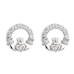 14 karat white gold & diamond claddagh earrings. 0.4'' diameter. Irish hallmarked gold. Imported from Dublin.