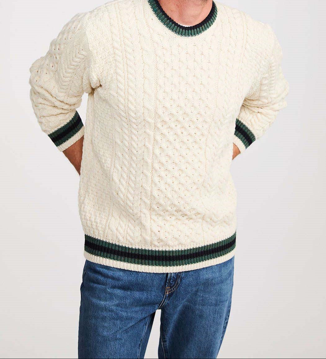 A contemporary update to the traditional Aran sweater, with the addition of stripes to the collar, cuffs and hem, delivering a preppy, sporty angle to the classic style. This piece works well for ladies too, so is essentially a unisex design. The stitch pattern incorporates a traditional honeycomb center, with a mix of cables and moss stitch to the sides. For a cool, sporty look, team with jeans and a T shirt. The darker colors pair well with dark chinos and a shirt for a more sophisticated look. Knitted in 100% Merino, in County Mayo, Ireland.